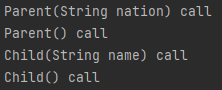 부모 클래스의 기본 생성자인 Parent()를 호출하게 되고, 이 기본 생성자에서 매개변수가 있는 생성자를 명시적으로 호출해주고 있기때문에, 부모클래스의 매개변수가 있는 생성자가 가장 먼저 호출되는것이다