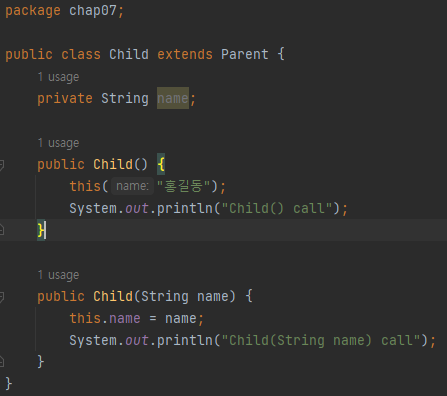 부모클래스의 생성자가 호출되고, Child()에서 다시 this("홍길동")을 먼저 호출하고 기본 생성자 call이 출력된다