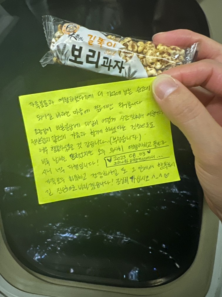 이 쪽지편지 한장이 우리의 여행을 크게 위로해 주었다. 아주 큰 이벤트가 되어 주었다.