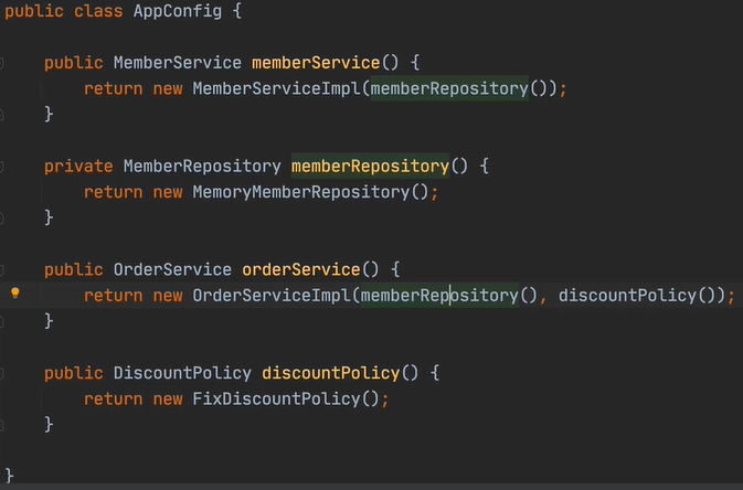 AppConfig는 애플리케이션의 전체 동작 방식을 구성(Config)하기 위해 구현객체를 생성하고, 연결하는 책임을 가지는 별도의 설정 클래스이다. 생성한 객체 인스턴스의 참조(레퍼런스)를 생성자를 통해서 연결(주입)해준다.